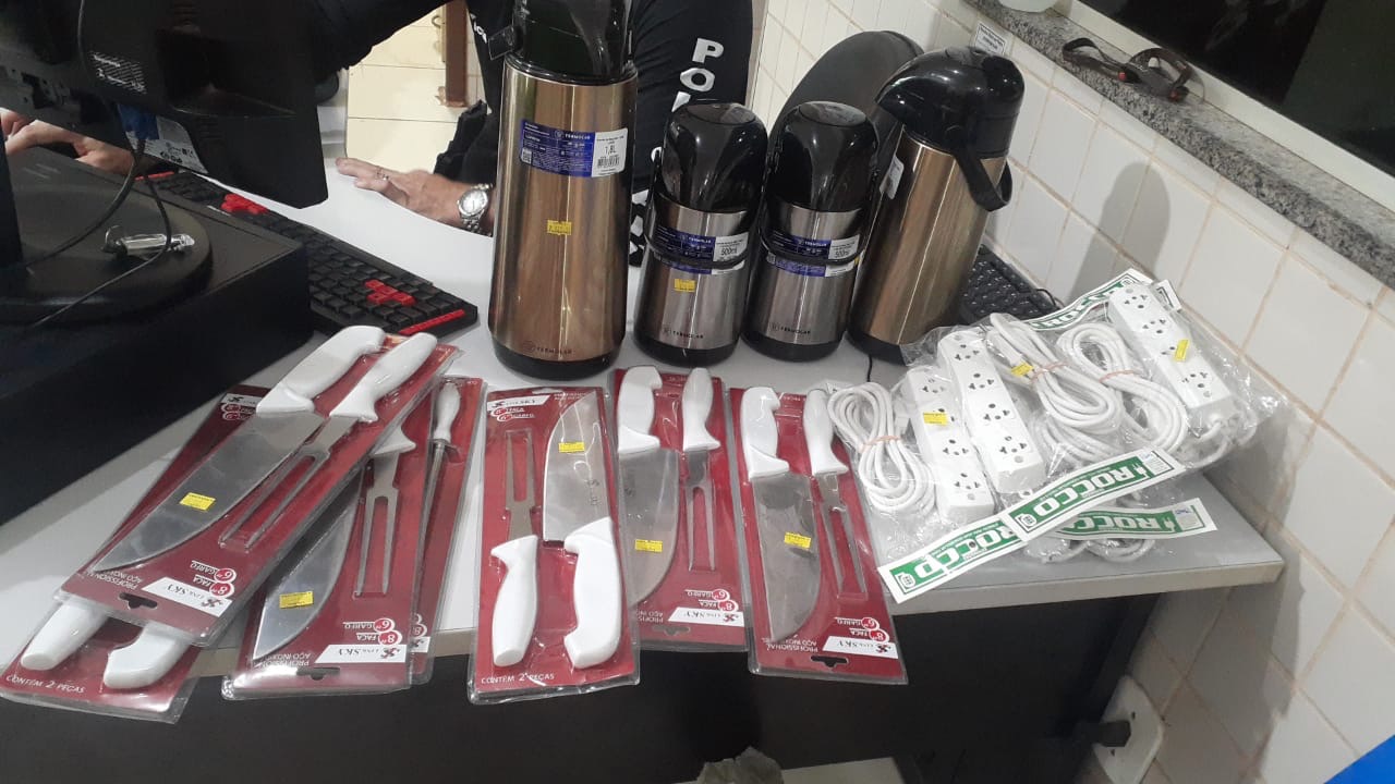 Entre os itens levados das lojas, destacam-se 02 garrafas térmicas Termolar de 1,81 avaliadas em R$259,98, 02 garrafas térmicas Termolar de 500ml avaliadas em R$210,00, 07 kits contendo faca e garfo para churrasco avaliados em R$167,93, 09 extensões elétricas da marca Rocco avaliadas em R$314,91 e 06 pares de botas avaliados em R$336,00.